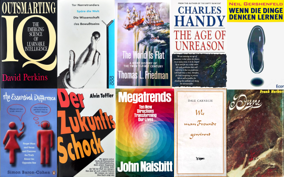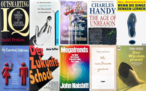 Neil GERSHENFELD »Wenn Dinge denken lernen«. Dieser MIT-Professor zeigte vor vielen Jahren, wohin die Entwicklung geht: u.a. miniaturisierte Chips in Gegenständen (z. B. in jedem Buch, das per Suchaufruf im Handy piepst, so daß sie es irgendwo im Hause finden können) oder ausgelagerte Intelligenz ans Internet, was völlig neue Mini-Computer zu Spottpreisen möglich macht, die derzeit auf den Markt kommen (weil das gigantische Betriebssystem unnötig wird) oder den 3D-Drucker (in seinem folgenden Buch „Fab“ weitergeführt), das uns nach dem DTP (DeskTop-Publishing) und derzeigem DTVP (Desk-Top Video-Produktion) als nächstes die DT-Mini-Fabrik beschert. Die ersten Geräte gibt es seit über 10 Jahren, aber jetzt kommen sie in fast normale Preisranges und wenn die Materialen noch etwas flexibler werden, können wir uns so manche Alltagsgegenstände lokal selber machen statt sie über den halben Globus zu transportieren…